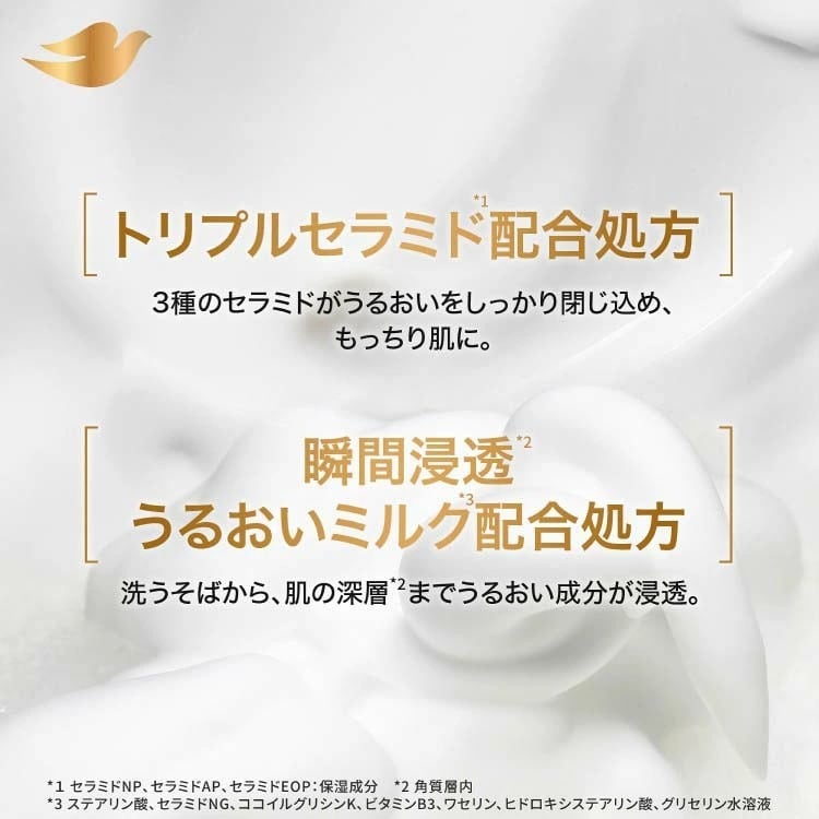 ●瞬間浸透*2うるおいミルク*3、トリプルセラミド*4配合だから、お風呂上りもうるおい続く。