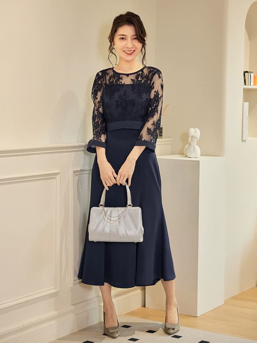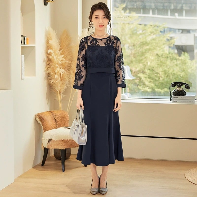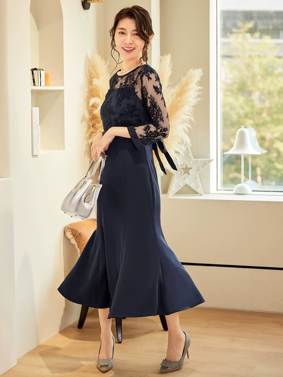 オールシーズン対応: 袖ありのデザインで、春夏秋冬、どの季節でも活躍するこのフォーマルドレスは、どんな場面でも上品で華やかな印象を与えます。